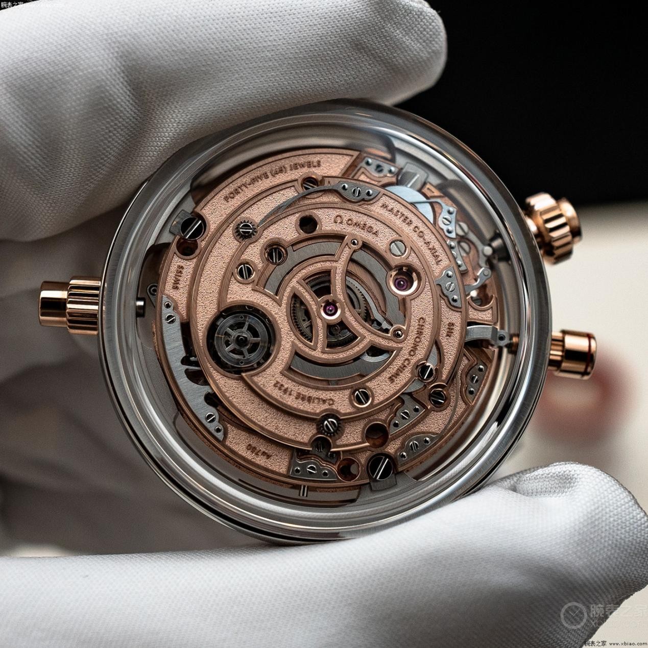 在机芯背面,可以看到追针计时部件。欧米茄在这只Chrono Chime追针报时上,使用的也是欧米茄独有同轴擒纵,并将摆频提升到36000次/时,这也是头一次。