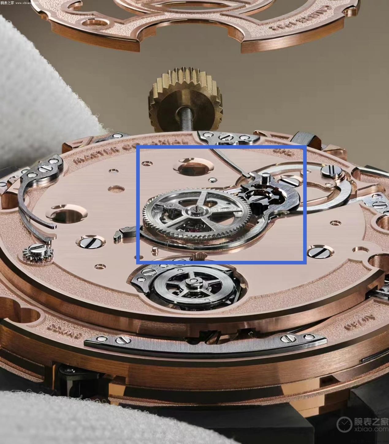 在机芯正面,除了两个音锤外,我们也可以看到三问报时的“调速飞轮”,用来控制报时的“速度、节奏”。有外媒消息表示,分钟/10秒/秒,报时间隔1.5秒,节奏连贯紧凑。