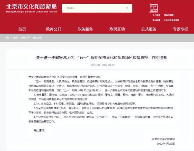据北京市文旅局消息,“五一”假期将至,人员流动性、聚集性增加,疫情传播扩散风险加大。为确保首都防疫安全和市民群众身体健康,确保满足市民群众节假日多样化、个性化、高品质的文化和旅游需求,让市民群众过一个安全、健康、欢乐、祥和的“五一”假期,根据首都当前疫情防控的需要,现就“五一”假期(4月30日至5月4日),进一步做好全市文化和旅游场所疫情防控工作通知如下: