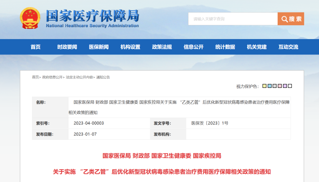 1月7日,国家医保局、财政部、国家卫生健康委、国家疾控局四部门联合发布《关于实施 “乙类乙管”后优化新型冠状病毒感染患者治疗费用医疗保障相关政策的通知》(以下简称《通知》)。