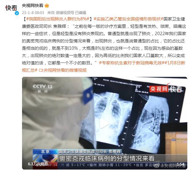 国家卫生健康委医政司司长 焦雅辉:“之前在每一版的诊疗方案里,轻型是有发热、咳嗽、咽痛这样的一些症状,但是轻型是没有肺炎表现的。普通型就是出现了肺炎,2022年我们国家的奥密克戎临床病例的分型情况来看,出现肺炎,也就是说普通型的占比,它的占比还是相当的低的,就是不到10%,大概是8%左右的这样一个占比,现在因为感染的基数大,出现肺炎的绝对数值一定是大的,因为再低的比例我们国家人口基数大,所以变成绝对值的话,它都是一个不小的数目。”