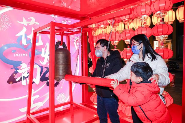 元旦期间,杭州武林银泰门口布置了“花灯初上”展台,吸引市民游客敲钟打卡。(受访者供图)