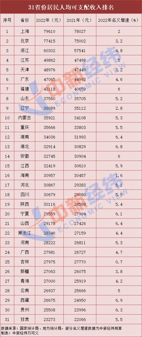对比该数据,上海(79610元)、北京(77415元)、浙江(60302元)、江苏(49862元)、天津(48976元)、广东(47065元)、福建(43118元)、山东(37560元)等8个省份2022年居民人均可支配收入跑赢全国线。