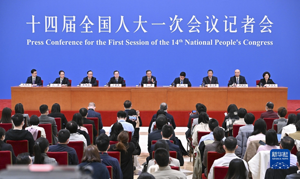 3月13日,十四届全国人大一次会议在北京人民大会堂举行记者会,国务院总理李强应大会发言人王超的邀请出席记者会,并回答中外记者提问。国务院副总理丁薛祥、何立峰、张国清、刘国中参加。新华社记者 李鑫 摄