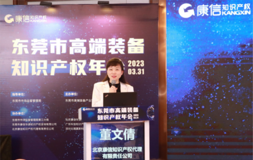 作为本次活动协办方代表,北京康信知识产权代理有限责任公司轮值执行合伙人董文倩在致辞中就东莞市高端装备产业知识产权运营平台矩阵建设进行嵌入式分享,通过分析知识产权保护当前面临的国际形势、国内政策环境以及企业现实需求,聚焦平台架构特色,分别从服务层、工具层、资源层介绍了该平台的运营机制。目前,该平台已完成知识产权一站式信息系统建设,与200多家企业建立托管服务,与清华大学、华南理工大学、北京大学深圳研究生院等多所院校建立合作关系,可为广大科技型企业提供全方位的知识产权运营及服务。