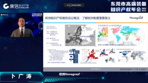 欧洲 Novagraaf 中国首席代表、欧洲专利律师卜广涛通过视频连线的方式作了《欧洲知识产权维权》的主旨分享,介绍了统一专利法院制度对欧洲专利诉讼的影响,以欧盟司法和行政程序为例介绍了欧洲知识产权维权诉讼概况,以期为中国企业的知识产权维权提供借鉴。