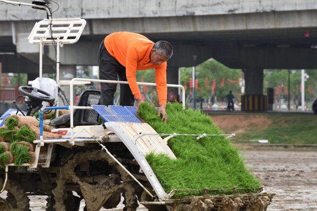 村头村工作人员香先生介绍说,今年水稻种植的品种是香雪丝苗,在天气良好的条件下,预计4天可以完成该农田的插秧工作,种植期约100天,一亩水稻的收成可达800多斤。