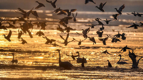 在位于陕西省合阳县的合阳黄河湿地自然保护区内,群鸟翔集嬉戏(2023年2月3日摄)。新华社发(赵晓罡 摄)