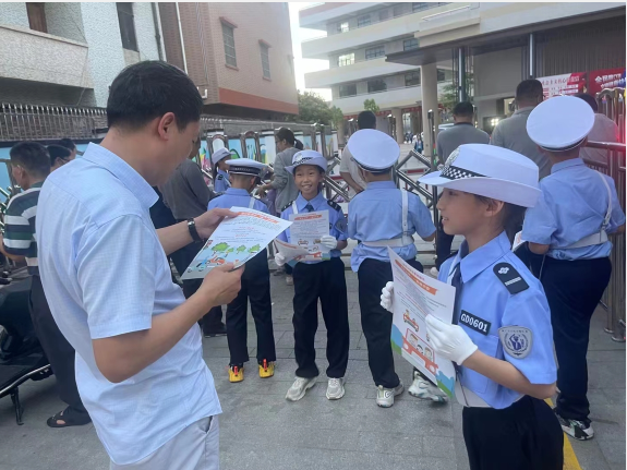 在校园门口,少警队员们向家长派发宣传资料,宣讲交通安全知识。他们还化身“文明交通劝导员”,向家长们开展“一盔一带”的宣传劝导教育。针对骑行电动车没有佩戴头盔的,提醒他们要正确佩戴;针对开小汽车来接送的,提醒他们不论坐前排后排都要系好安全带。