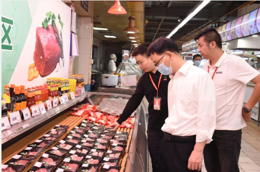 在嘉荣超市,何日亮详细检查了散装食品销售区和肉类销售区,查看相关台账以及销售食品存储管理情况,并深入了解超市目前的经营管理等情况,他叮嘱超市经营方要持续提升食品安全管理能力,按照“放心肉菜示范超市”创建相关要求,让消费者放心消费、安心消费,让消费者的“菜篮子”更丰富、更安全。