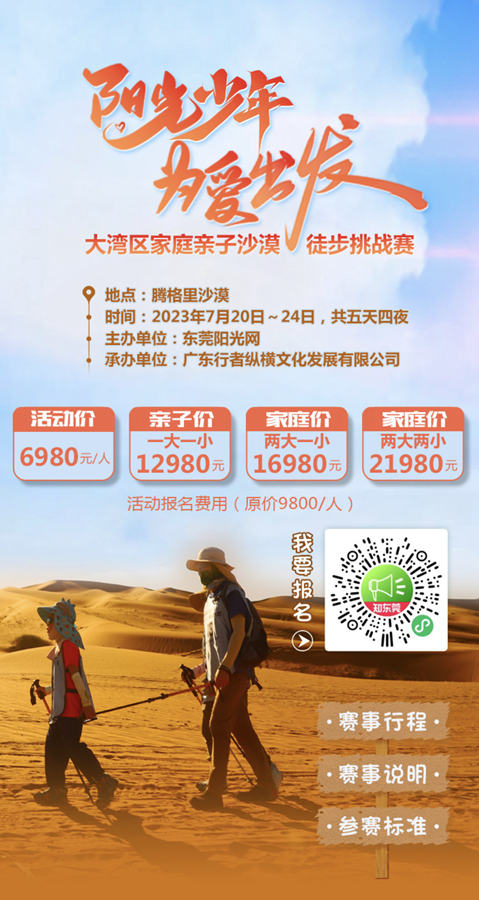 近年来,随着国家对体育行业的重视,户外徒步赛事逐渐盛行。5月22日上午,由东莞阳光网主办的“阳光少年 为爱出发”大湾区家庭亲子腾格里沙漠徒步挑战赛报名通道正式开启。本次徒步挑战赛将从7月20日持续至24日。