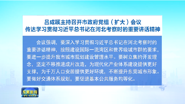 会议强调,要深入学习贯彻习近平总书记在河北考察时的重要讲话精神,按照建设国际一流湾区和世界级城市群的要求,进一步提升我市城市规划建设管理水平。要树立集约开发理念,坚定不移推进成片改造,为现代化产业体系建设提供更好支撑,为千万人口安居提供更好环境,不断提升东莞城市形象。要做好交通体系规划,要促进基本公共服务均等化。