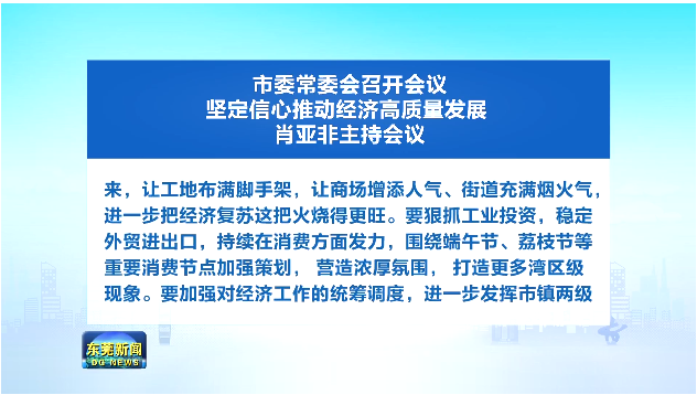 会议强调,要认真学习领会习近平总书记在中央财经委员会会议上的重要讲话精神,全面贯彻落实总书记、党中央关于经济工作的决策部署,加强党委对经济工作的领导,加快推动经济高质量发展。要坚定信心,充分调动社会各界力量,火力全开,把投资、生产、消费等各方面的热情调动起来,让工地布满脚手架,让商场增添人气、街道充满烟火气,进一步把经济复苏这把火烧得更旺。要狠抓工业投资,稳定外贸进出口,持续在消费方面发力,围绕端午节、荔枝节等重要消费节点加强策划,营造浓厚氛围,打造更多湾区级现象。要加强对经济工作的统筹调度,进一步发挥市镇两级经济高质量发展指挥体系作用,加快产业立新柱,培育壮大新动能,推动外资企业转型升级,帮助企业解决好历史遗留问题。要积极争取上级支持,把更多工作纳入国家、省战略层面。