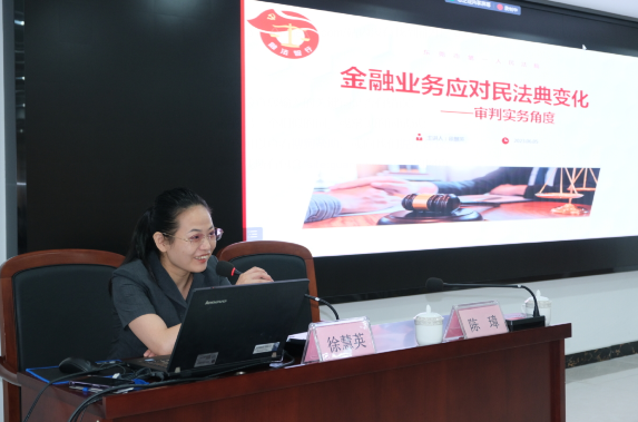 课上,徐慧英法官作了题为“金融业务应对民法典变化——审判实务角度”的讲座,围绕《民法典》有关规定的变化,就金融业务中的贷前审查、贷中合同管理、贷后跟踪救济以及审判实务中的计息规则等方面进行了详细阐述。随后,通过以案释典、以案说法等形式,重点解读了金融担保制度、明确租赁物已转移占有的抵押不破租赁、格式合同条款,以及民法典新增的违约方解除权等内容。