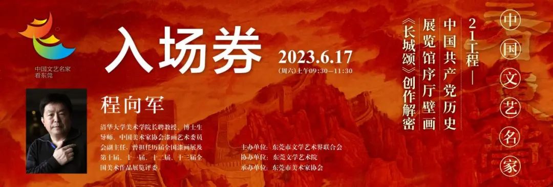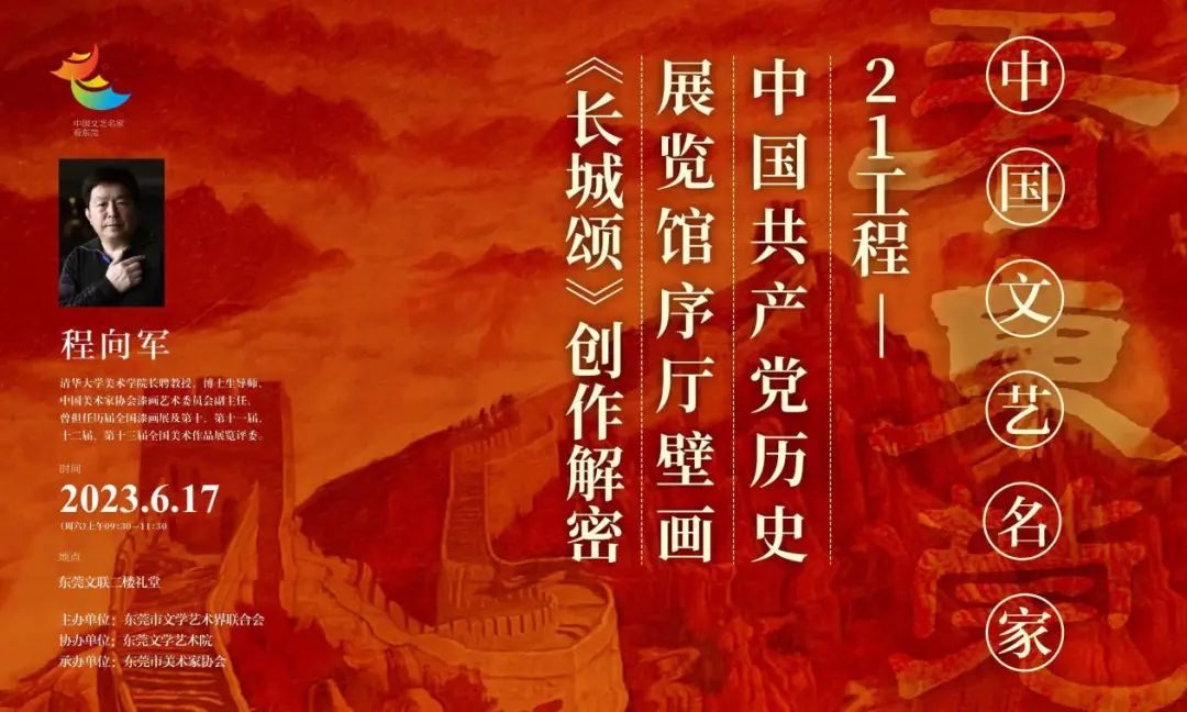 6月17日(周六)上午,东莞市文学艺术界联合会将邀请这幅作品的作者、清华大学美术学院教授程向军做客东莞,他将以《21工程—中国共产党历史展览馆序厅壁画《长城颂》创作解密》为主题,在东莞文联二楼礼堂现场与广大文艺工作者对话交流,讲述漆壁画《长城颂》诞生的故事。