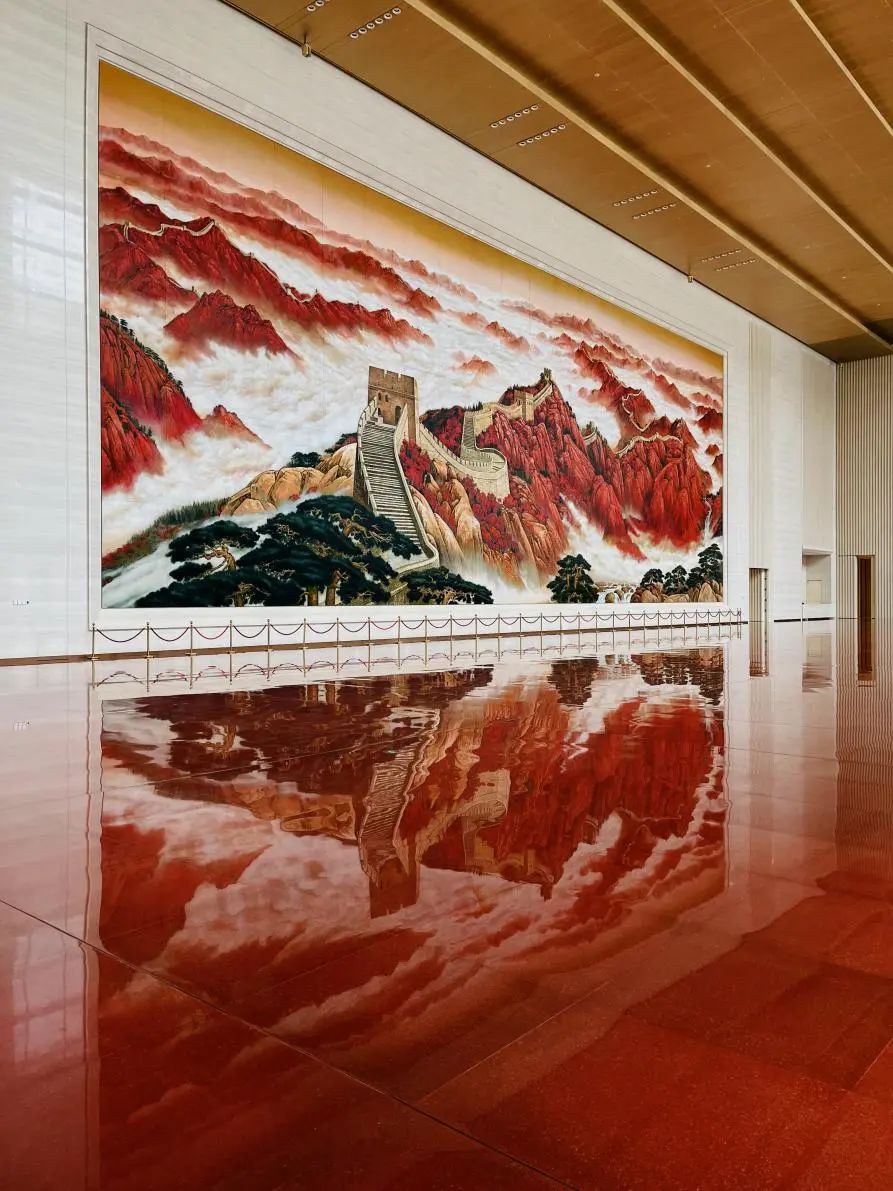 走进中国共产党历史展览馆序厅,一幅高15米、宽40米的大型漆壁画《长城颂》震撼亮相。作品由100块2米×3米的漆板组成,寓意建党100周年,是为建党百年献上的一份厚礼。《长城颂》釆用中国绘画平远法鸟瞰式构图和建筑干挂技术安装,总面积达600平方米,表现历经数千年岁月磨洗的长城,至今依然屹立在世界的东方,这幅世界上最大的漆壁画已经成为这座红色新地标的艺术名片。