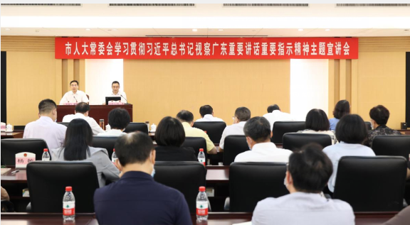 6月14日,市人大常委会学习贯彻习近平总书记视察广东重要讲话重要指示精神主题宣讲会举行,邀请市委宣讲团成员、市委党校经济学教研部主任何清作宣讲辅导,切实把思想和行动统一到习近平总书记的重要讲话、重要指示精神上来。市人大常委会主任骆招群出席宣讲会,市人大常委会副主任潘新潮主持会议。