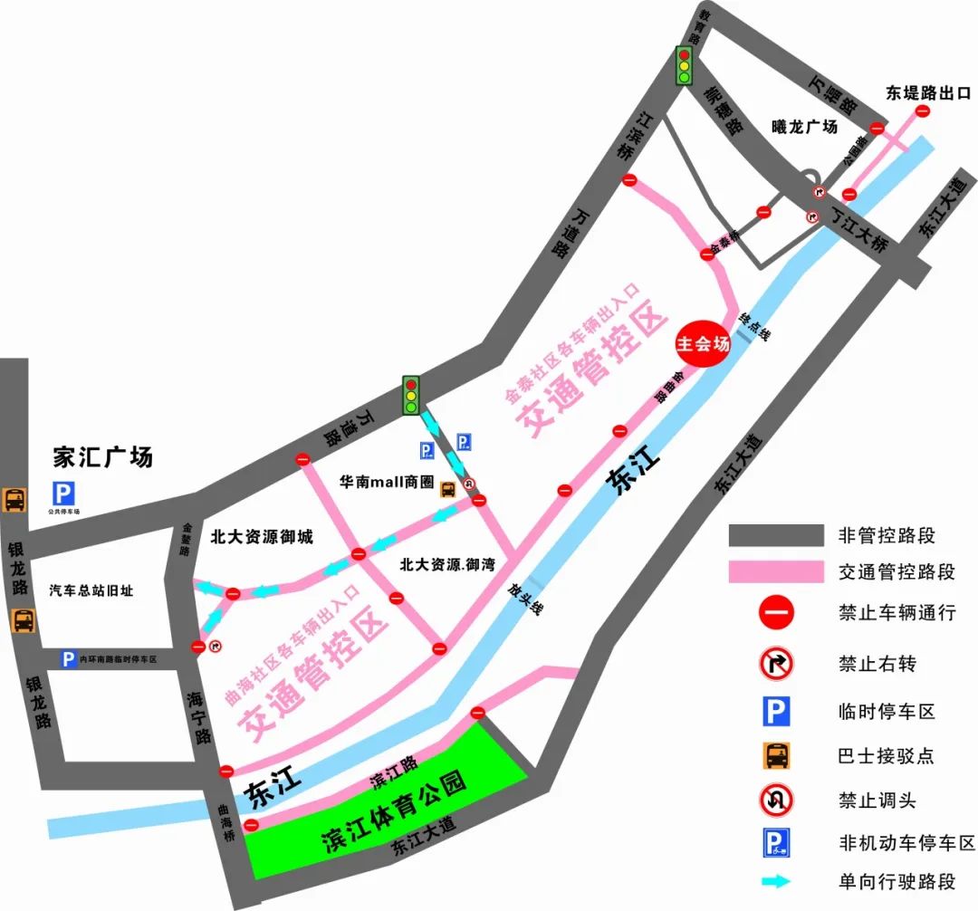 中心区东路(华南摩路段)及内环南路将实行临时单向行驶交通管控(行驶方向详见交通封控示意图),请北大资源御湾·御湾及北大资源御湾·御城小区业主注意车辆行驶方向。