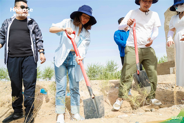 此次“碳绿丝路”荒漠绿洲共建活动中,NPO绿色生命公益组织创始人易解放(易妈妈)指导现场志愿者代表们共同种下了最新一批梭梭树苗。 “植树造林,让荒漠变绿,让人心变绿,让人的眼光变绿。绿水青山就是金山银山,这个行动需要每一个有责任感、有爱心的中国人。海信是一个有情怀、有眼光、有觉悟的公司。” 对于抱持公益理念并不断践行的海信,易妈妈给予了极高认可。