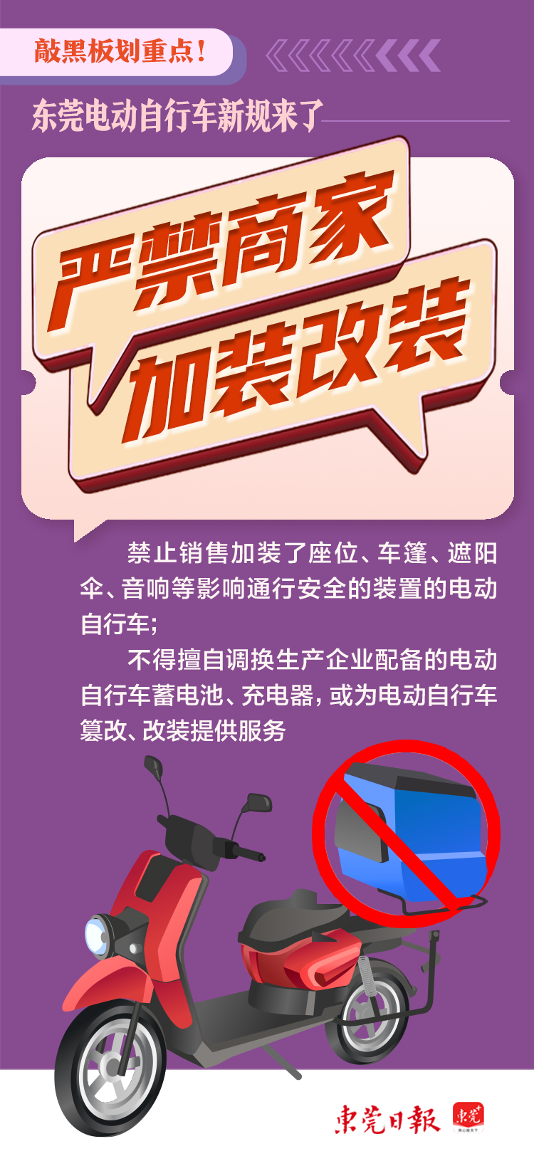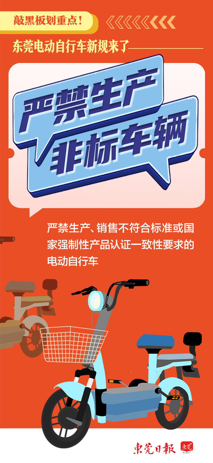 近日,东莞市市场监督管理局、东莞市公安局、东莞市消防救援支队联合发布《关于遵章守法生产销售使用电动自行车的通告》,就电动自行车及相关产品在生产、销售、使用等方面的安全管理提出了多项具体要求。