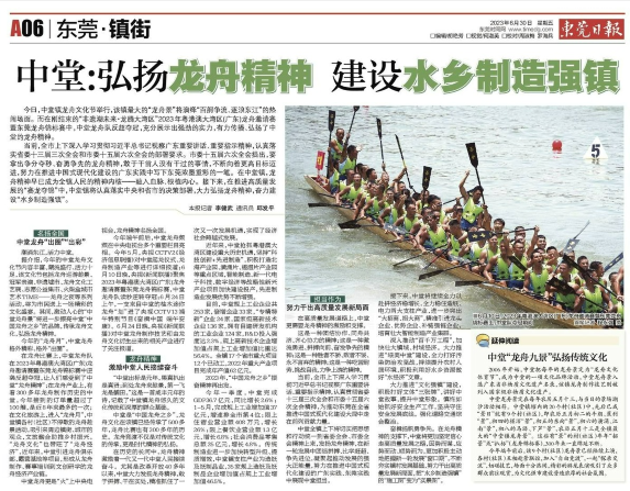 当前,全市上下深入学习贯彻习近平总书记视察广东重要讲话、重要指示精神,认真落实省委十三届三次全会和市委十五届六次全会的部署要求。市委十五届六次全会提出,要拿出争分夺秒、奋勇争先的龙舟精神,敢于干前人没有干过的事情,不断向着更高目标迈进,努力在推进中国式现代化建设的广东实践中写下东莞浓墨重彩的一笔。在中堂镇,龙舟精神早已成为全镇人民的精神内核——融入血脉、根植内心。接下来,在推进高质量发展的“赛龙夺锦”中,中堂镇将认真落实中央和省市的决策部署,大力弘扬龙舟精神,奋力建设“水乡制造强镇”。