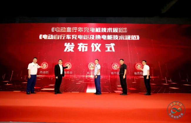广东省消防救援总队、广东省市场监督管理局、广东质检院、广州市消防救援支队、广东省电动车商会等多位领导出席电动车高质量发展大会暨换电共享产业链峰会并共同启动《电动自行车充电桩技术规范》、《电动自行车充电柜及换电柜技术规范》正式发布仪式。