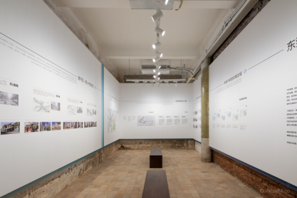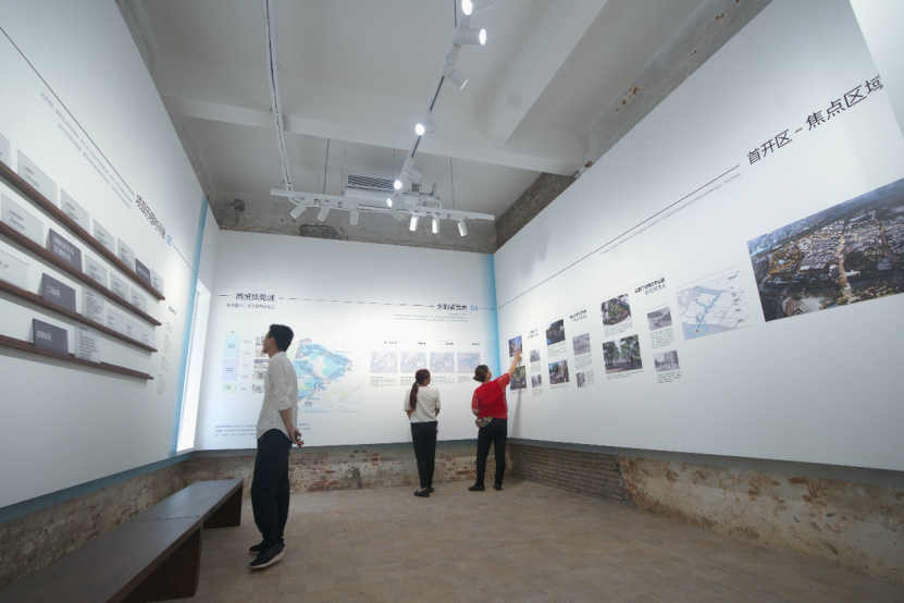 此外,展厅保留了原空间部分古朴的旧砖墙面,并增设极简的白色展陈墙面,辅以象征水的蓝色带状装饰,将历史与当代连接。