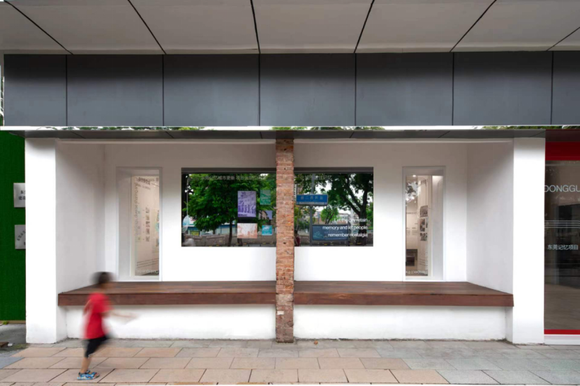 在设计语言上,街坊议事厅呈现出一种“对话”的姿态。展厅内设置了多处长凳方便公众交流,“留言墙”静待着来客书写对莞城的期许。展厅外侧也设置了户外座椅及海报宣传栏,镜面玻璃映射着人来人往,向周围居民发出驻足片刻的邀请。