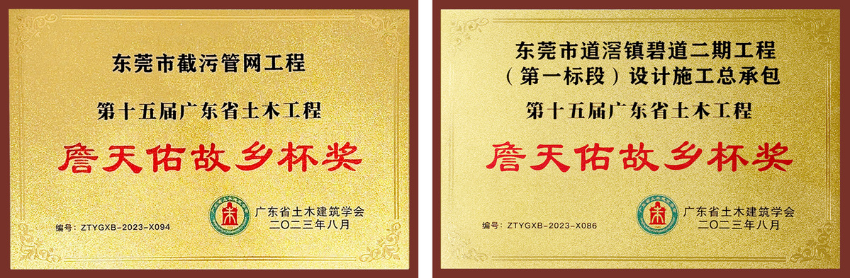 近期,广东省土木建筑学会公布了第十五届广东省土木工程詹天佑故乡杯奖获奖工程名单,由岭南股份承建的“东莞市东江下游片区水污染综合治理工程(石碣镇污水收集系统完善工程)”、岭南股份下属设计集团参与规划设计的“东莞市道滘镇碧道二期工程(第一标段)设计施工总承包”两个项目荣获该奖项。