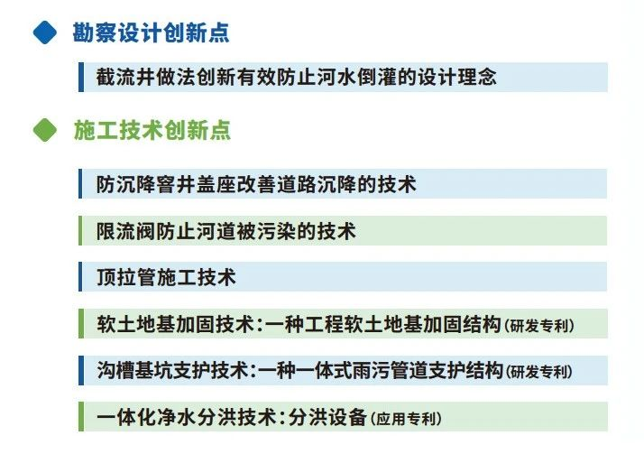 项目建设过程中,岭南股份在勘察设计、施工技术方面进行创新,并使用了多项专利,如创新勘察设计有效防止了河水倒灌;通过防沉降窨井盖座改善道路沉降的技术、限流阀防止河道被污染的技术、顶拉管施工技术等,保障了雨污分流效果,同时提升施工速度,减少对交通、周边群众及建筑的影响,且改造量小、成本低;自主研发专利的应用则有助于加强地基稳定性和提升工程安全性。