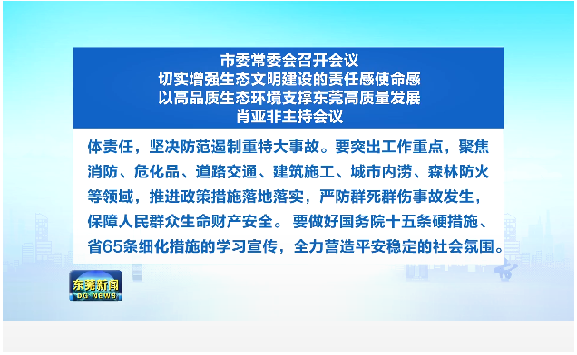 会议强调,要深入学习贯彻习近平总书记关于安全生产重要论述,深刻认识到肩上沉甸甸的责任,压紧压实安全生产党政领导、部门监管、企业主体责任,坚决防范遏制重特大事故。要突出工作重点,聚焦消防、危化品、道路交通、建筑施工、城市内涝、森林防火等领域,推进政策措施落地落实,严防群死群伤事故发生,保障人民群众生命财产安全。 要做好国务院十五条硬措施、省65条细化措施的学习宣传,强化各级各部门的责任意识,企业负责人安全红线意识,企业职工安全生产意识,全力营造平安稳定的社会氛围。(记者 吴燕玲)(来源:东莞广播电视台)