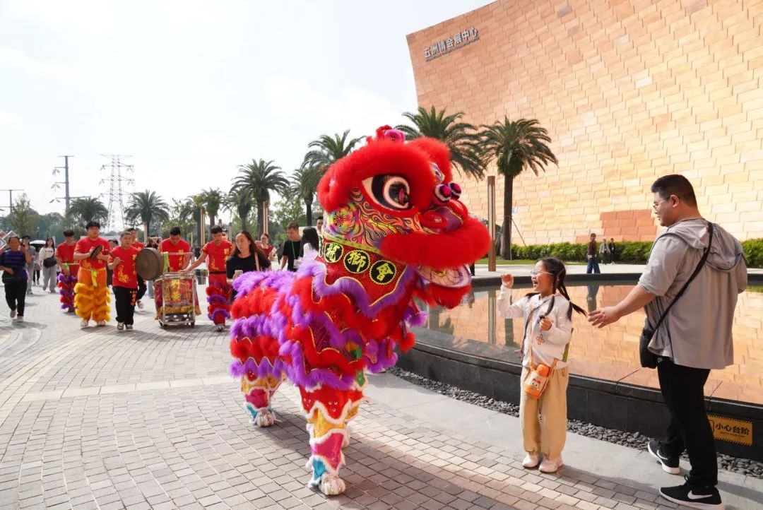 在茶山主题馆前,伴随着激烈与震撼人心的鼓点,两只醒狮翩然起舞,这正是茶山茶园游会的精彩瞬间。刘黄醒狮队一会舞起狮子,一会演起了大头佛,让小朋友或大朋友都沉浸其中,观众纷纷拍照打卡。