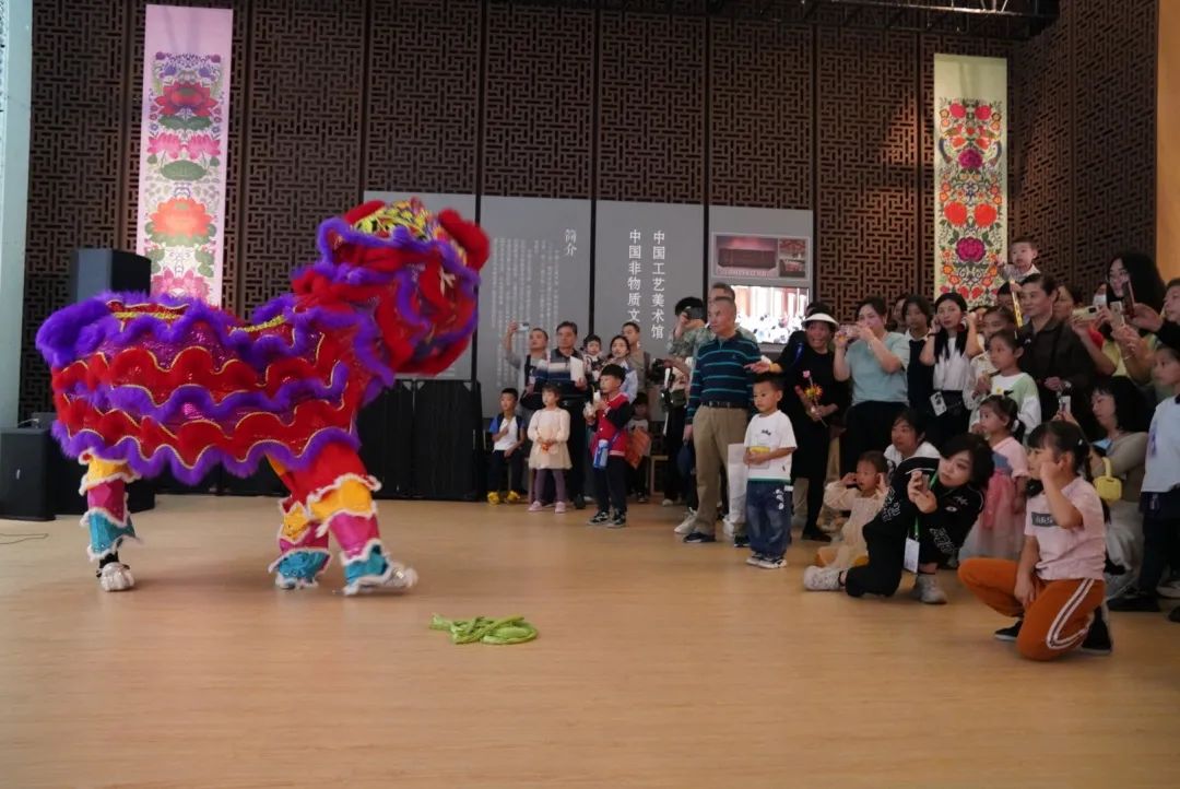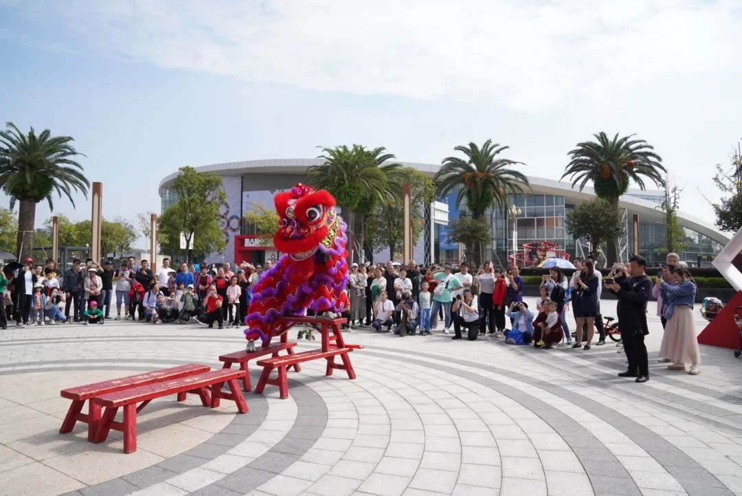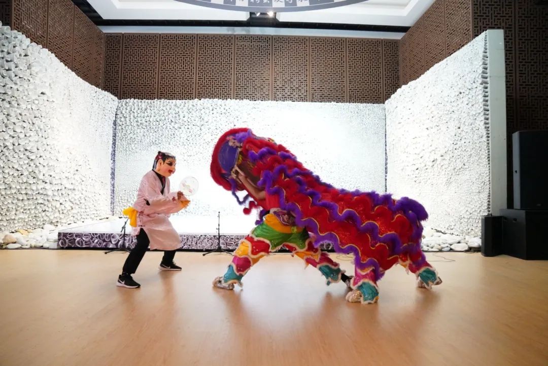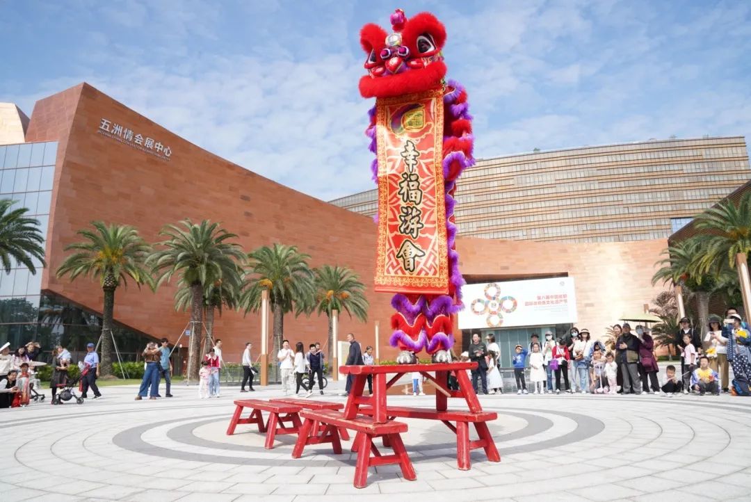 最热闹精彩的莫过于刘黄醒狮的专场表演。在成都国际非遗博览园的五洲情会展中心门口,热烈的锣鼓声吸引了大批观众,狮子在长条凳上来回跳跃,引得称赞声、掌声不断。醒狮队更是一路舞进了场馆,瞬间成为了全场的焦点。