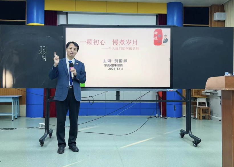 当天下午,全国优秀教师、全国语文教育专家、教育部国培计划培训专家贺国卿带来了以《一颗初心 慢煮岁月——今天我们如何做老师?》为题的讲座。讲座现场,贺国卿把赢字拆分为“亡”“口”“月”“贝”“凡”几部分,分别代表“危机意识”“表达能力”“时间观念”“财富和知识”“平常心态”,同时也对应师德的不同层面。