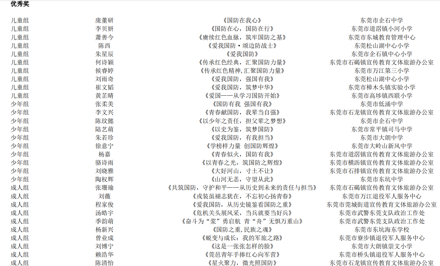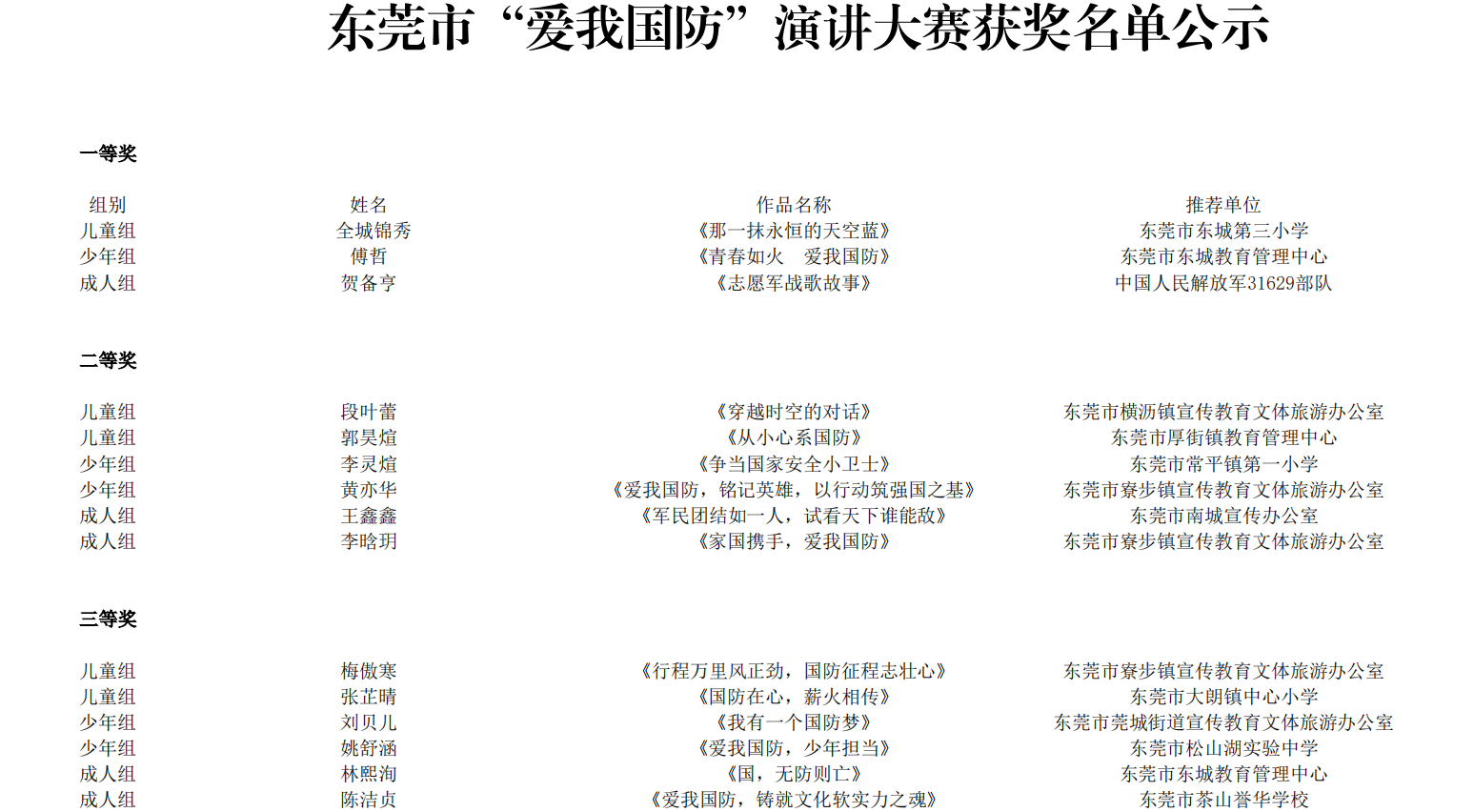 作为东莞市2024年“全民国防教育月”活动的重要内容,“爱我国防”演讲大赛吸引了全市众多选手踊跃参与。经过激烈角逐,最终分别评出了儿童组、少年组、成人组的一二三等奖。