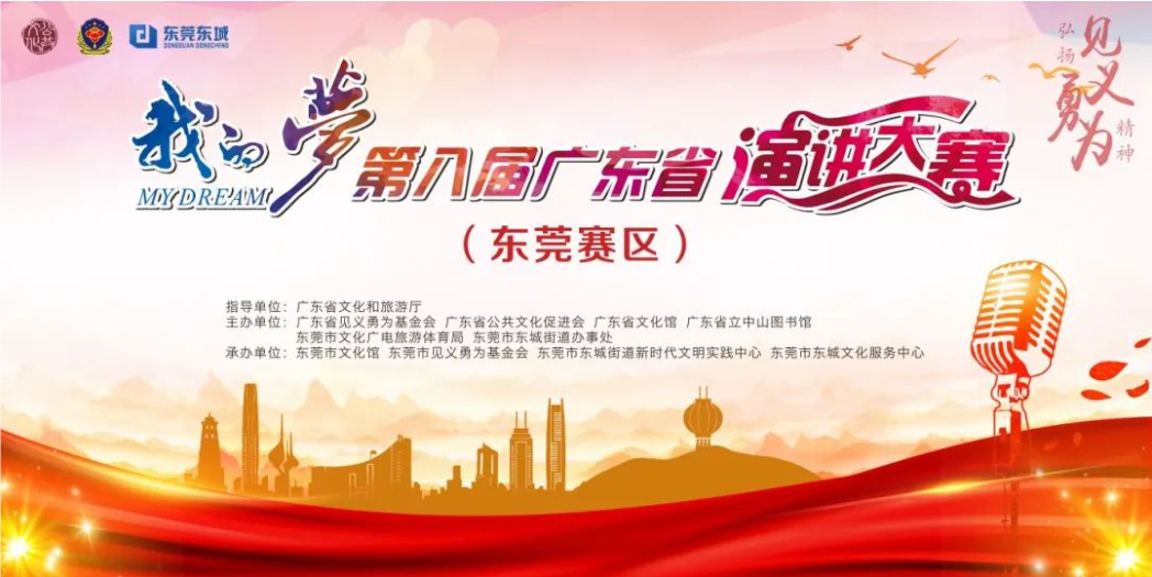为弘扬社会主义核心价值观、彰显中华民族优秀文化内涵、挖掘和选拔演讲人才、提高广东省群众演讲水平,由广东省文化和旅游厅指导,广东省见义勇为基金会、广东省公共文化促进会、广东省文化馆、广东省立中山图书馆、东莞市文化广电旅游体育局、东莞市东城街道办事处联合主办,东莞市文化馆、东莞市见义勇为基金会、东莞市东城文化服务中心等单位协办的“我的梦”第八届广东省演讲大赛东莞赛区报名已启动。具体要求如下: