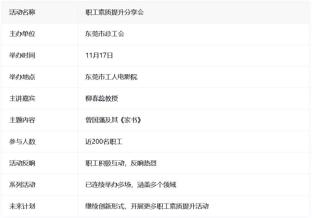 通过本次分享会,职工们不仅对曾国藩的《家书》有了更深的理解,也在自我修养和家庭教育的理念上得到了新的启示。东莞市总工会的这一系列举措,无疑对提升职工队伍的整体素质,推动企业文化建设向更高层次发展起到了积极的推动作用。