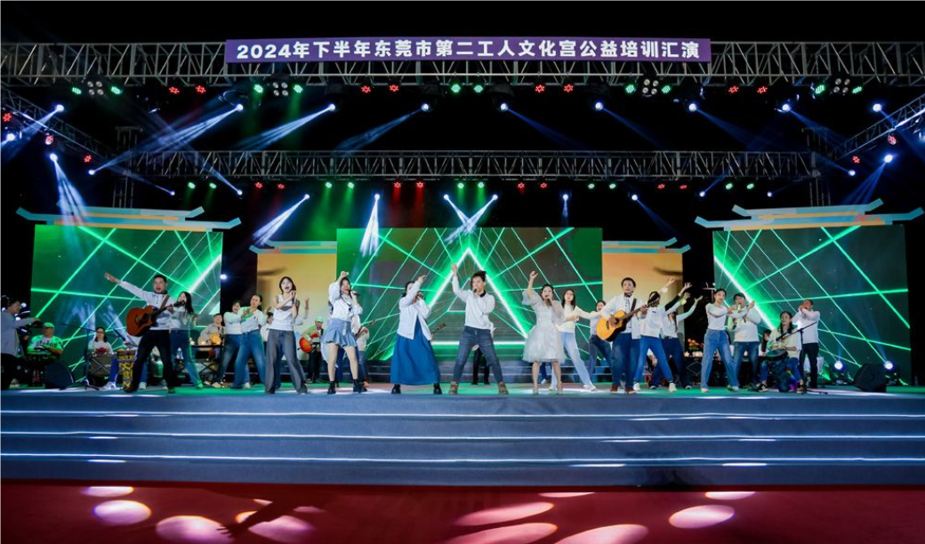 东莞市第二工人文化宫于1月4日晚上成功举办了一场名为“情聚文化宫 有你更精彩”的2024年下半年公益培训汇演。此次汇演不仅展示了东莞市产业工人的多才多艺,还彰显了文化宫在推动职工文化建设和弘扬传统文化方面取得的显著成果。汇演在欢快节奏的开场舞《青苹果乐园》中拉开帷幕。随后,民乐队一弹拨乐器组齐奏《春天来了》,尤克里里弹唱《对面的女孩看过来》,以及国粹京剧《梨花颂》等精彩节目轮番上演,赢得了现场观众的阵阵掌声。整个汇演分为三个篇章:上篇“铭恩岁月・咏时代赞歌”、中篇“勇立潮头・逐时代之光”和下篇“燃烧激情・绘时代画卷”。这些篇章不仅展现了东莞市产业工人的精神风貌,更反映了他们在时代变迁中勇于担当、积极向上的精神品质。