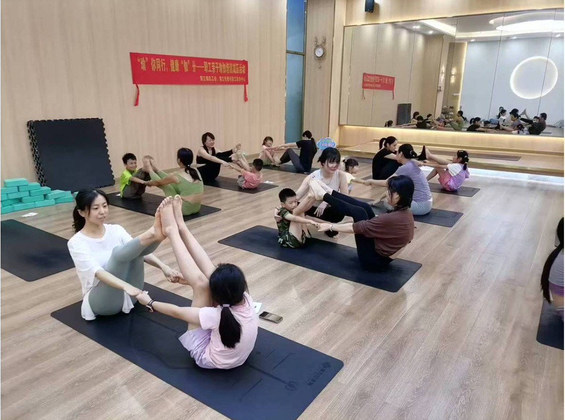 七月骄阳透过落地窗,在美力恒健身游泳俱乐部的木地板上投下明暗交错的光斑。舒缓的瑜伽音乐流淌中,八岁男孩小峰突然咯咯笑起来——他的母亲正颤巍巍单腿站立,两人手掌相抵维持着"亲子树式"的平衡。"妈妈别晃呀!"稚气的抱怨声未落,母子俩已笑作一团。7月13日这场由黄江镇总工会举办的亲子瑜伽活动,让12组平日忙碌的职工家庭在汗水中重拾亲密时光。