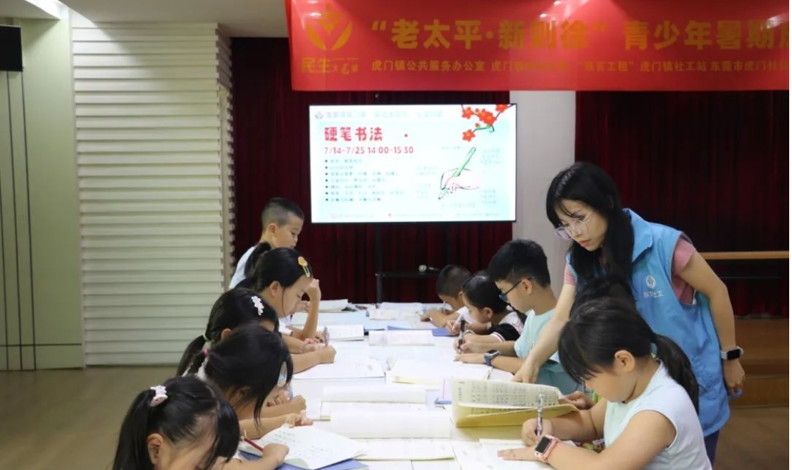 7月盛夏,虎门镇则徐社区新时代文明实践站内墨香与欢笑声交织。“老太平·新则徐”青少年暑期成长营正如火如荼开展,这是由镇公共服务办指导、“双百工程”社工站联动社区打造的民生项目。150名社区儿童分两期参与:首期自7月14日延续至8月1日,二期将于8月4日接续展开。硬笔书法、科学实验、非洲鼓、创绘手工四类主题课程,正为孩子们编织多彩暑期记忆。