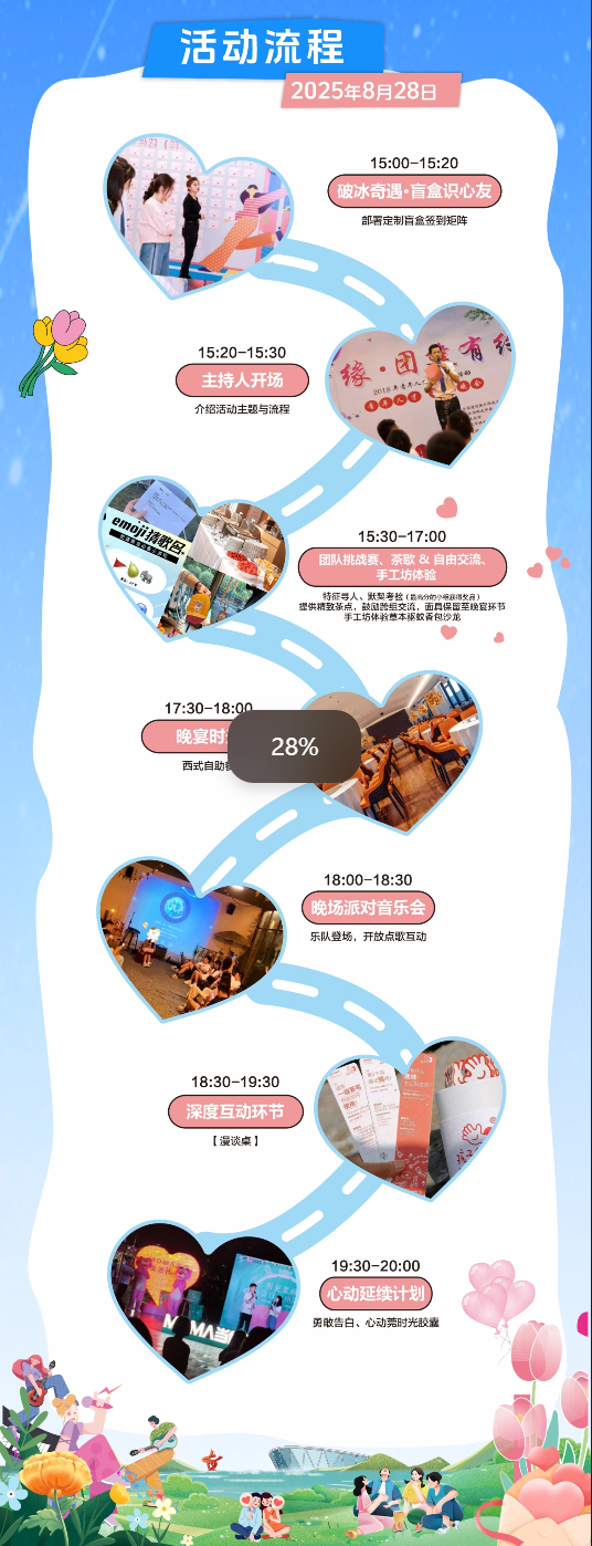 活动精心设计"五维互动"体验模式:开场"盲盒识心友"环节采用AI智能匹配系统,通过趣味问答生成专属缘分报告;团队挑战赛设置星空露营、非遗手作等6大任务关卡,考验协作能力的同时解锁城市记忆;特别策划的"草本工坊"体验区,由中医药专家现场教授驱蚊香囊制作技艺,让传统文化融入现代社交。最受期待的"心动延续计划"将设置30秒告白舞台,成功配对的青年将获赠镶钻星空瓶,寓意"封存此刻,续写未来"。