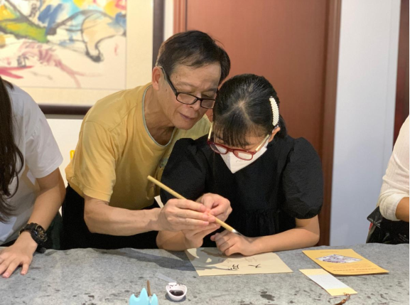 在“东莞名人书画作品展”上,书画专家现场教学,和参加活动的大小朋友一起互动,手把手正确握笔及基本笔画的练习。市民游客在现场按照专家指导的方法开始临摹。