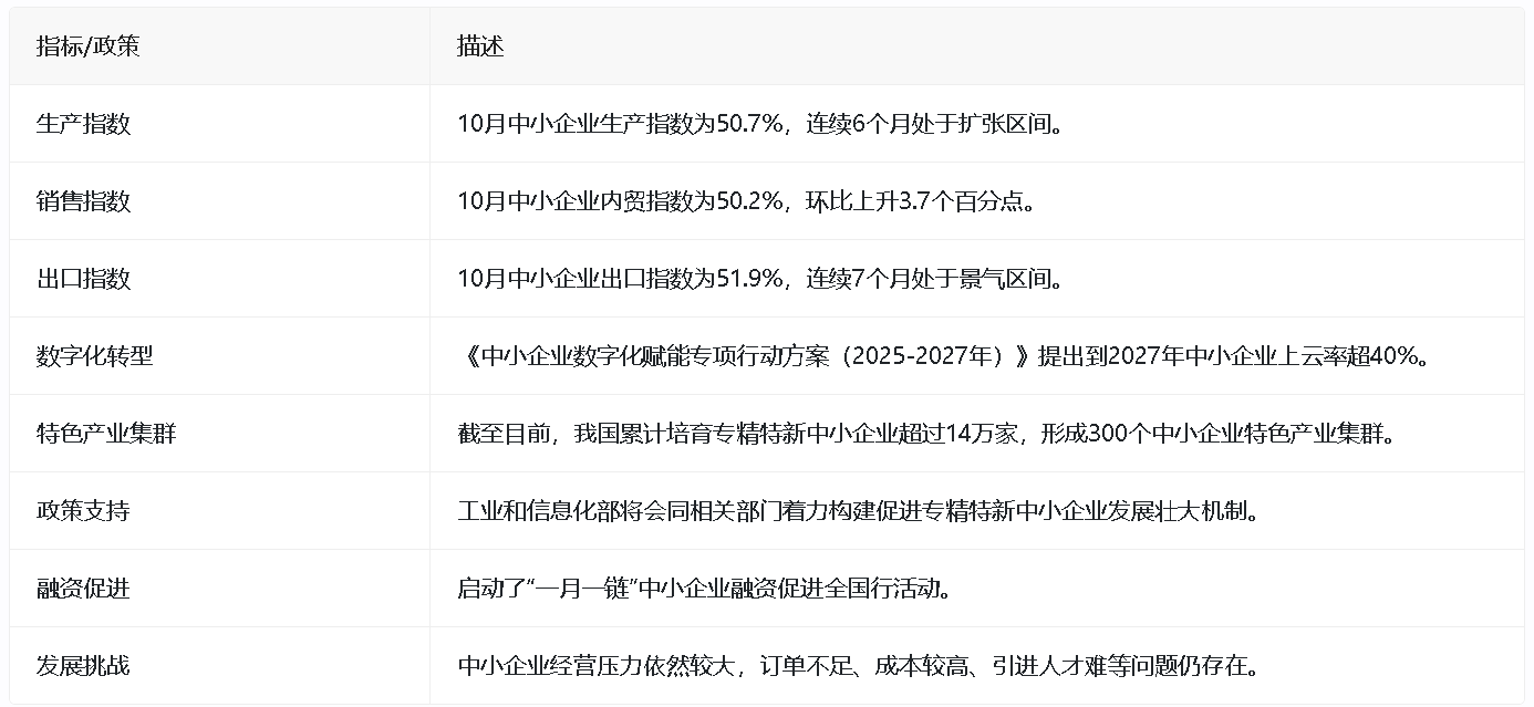 工业和信息化部中小企业局局长梁志峰表示,受益于一揽子增量政策逐步发力显效,市场需求回升,中小企业信心增强。从生产端看,今年以来,中小企业生产总体保持平稳扩张状态,10月中小企业生产指数为50.7%,已连续6个月处于扩张区间。从销售端看,国内市场需求回暖,带动中小企业国内销售大幅回升,10月中小企业内贸指数为50.2%,环比上升3.7个百分点。此外,10月中小企业出口指数为51.9%,连续7个月处于景气区间。