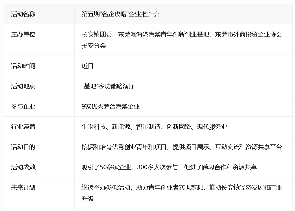 表格:长安镇第五期“名企攻略”企业推介会概览