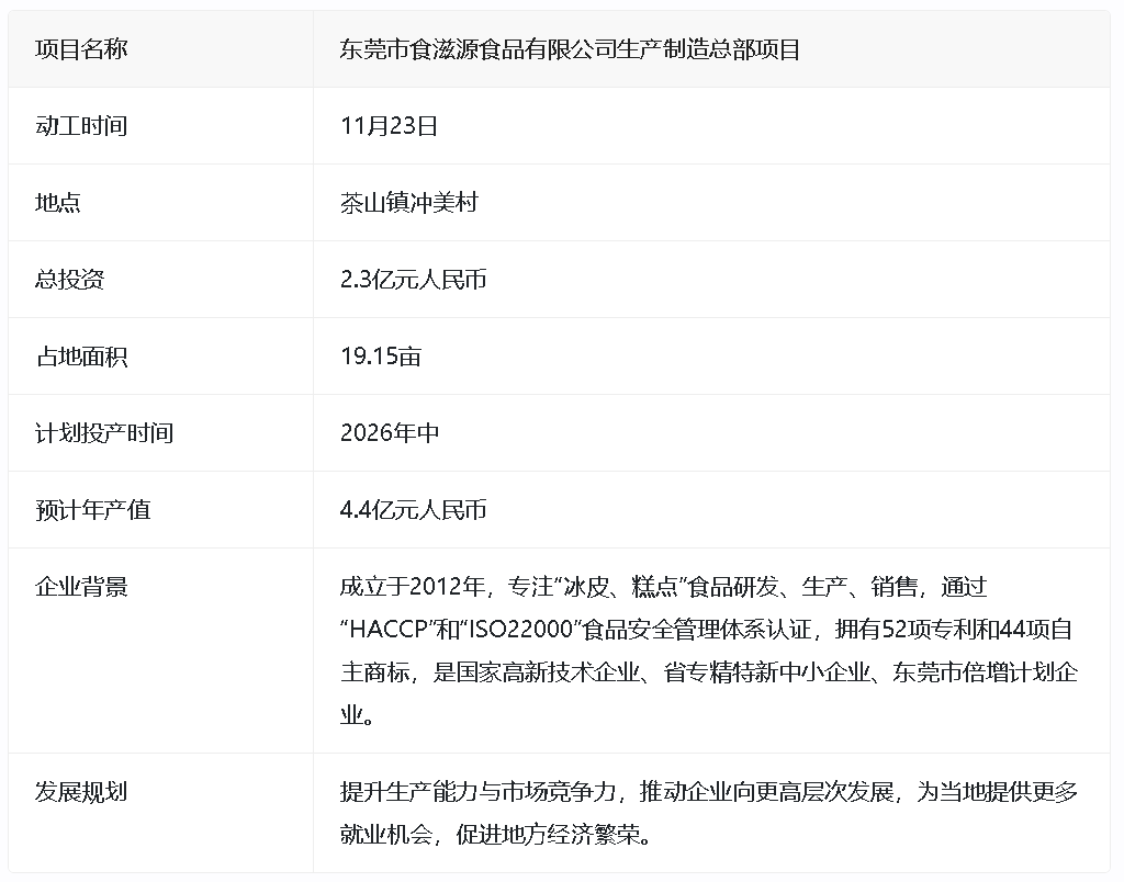 东莞市食滋源食品有限公司生产制造总部项目的动工,是东莞市食品产业发展的一个重要里程碑。项目的成功实施,不仅有助于企业自身的发展,也将为东莞市的经济社会发展做出积极贡献。我们期待项目早日建成投产,为东莞市的食品产业增添新的光彩。