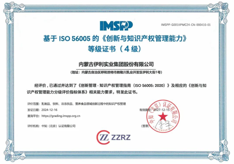 日前,国际标准化组织ISO(International Organization for Standardization)公布《创新与知识产权管理能力》等级证书(4级)名单【以下简称:ISO56005 等级证书(4级)】,伊利股份荣列其中!获此殊荣的伊利股份,不仅是国内食品行业首批ISO56005(4级)持证企业,更成为全球创新管理和知识产权管理的领先企业。