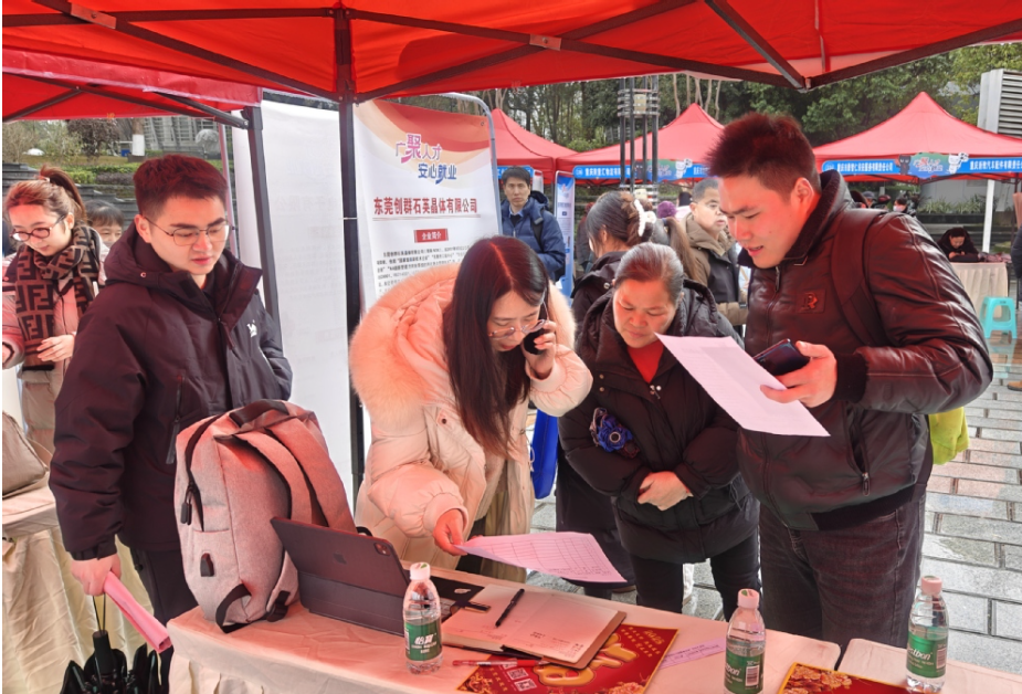 连日来,大朗镇以“早春快马”的姿态开启跨省劳务协作,帮助企业稳岗用工冲刺“开门红”。该镇组织企业赴四川广安开展外出招聘活动,并通过“专列+专车”模式,为广安籍务工人员提供从“出家门”到“进厂门”全程无忧返岗服务,为企业稳岗复产注入强劲动力。近日,大朗人社分局携镇内优质企业赴四川广安参加2025年四川省“春风行动”启动仪式(广安分会场)。此次活动以“春风送岗促就业·精准服务暖民心”为主题,促进两地劳务供需对接,助力企业解决节后招用工问题。其间,大朗组织长盈精密技术、以诺通讯、华科电子、创群石英晶体等企业现场设摊招聘,共提供近800多个就业岗位。