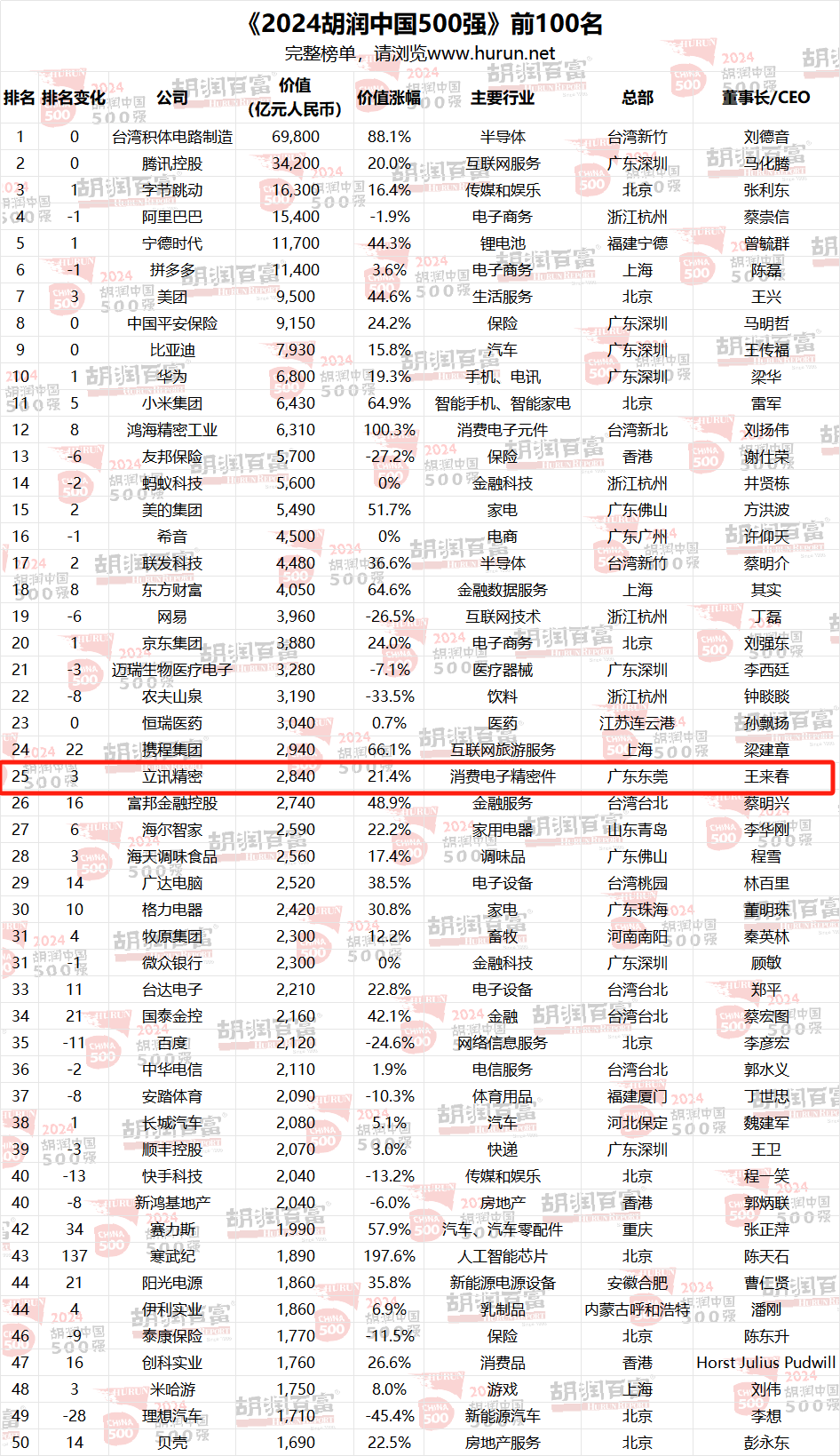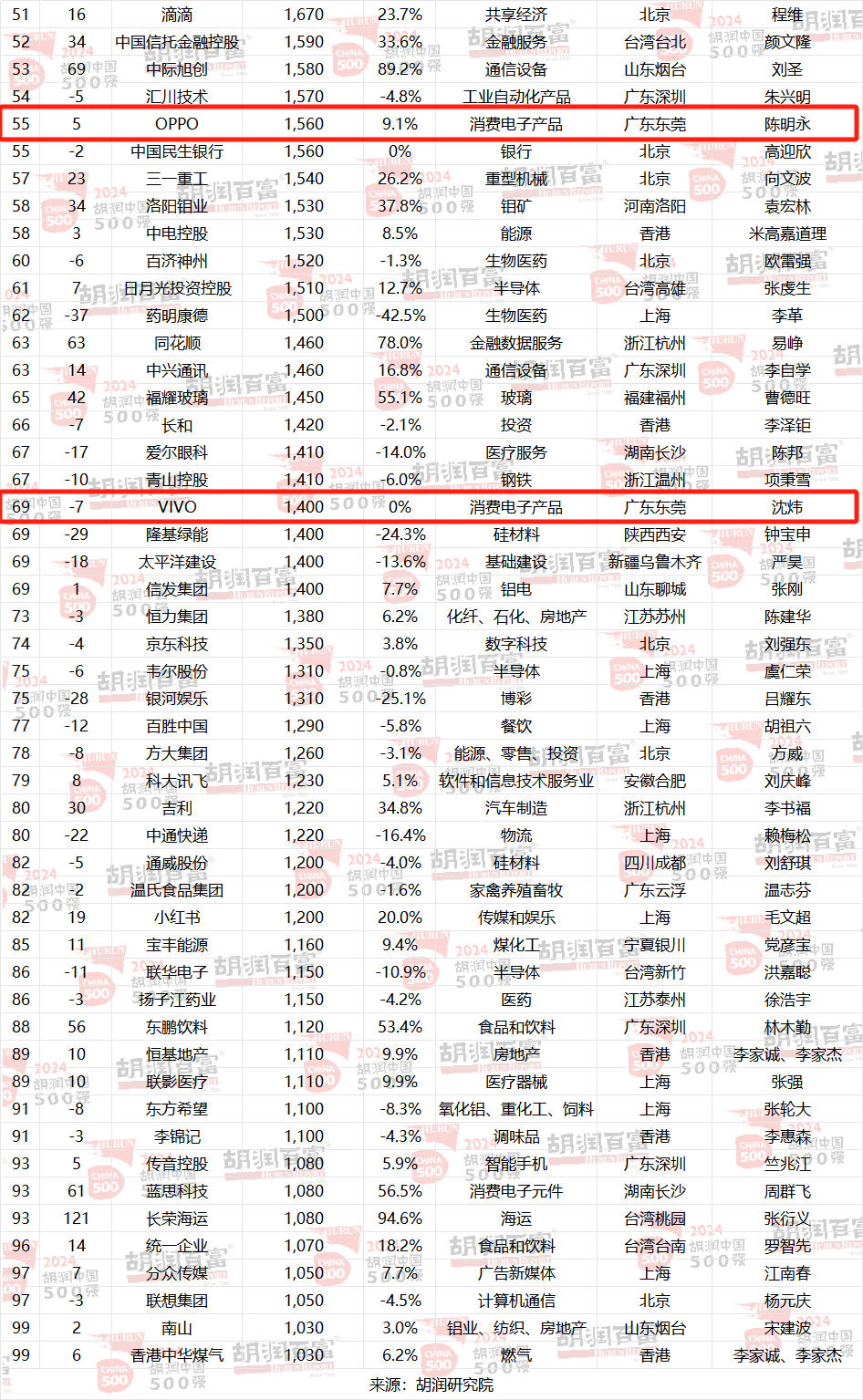 胡润研究院2月25日发布的《2024胡润中国500强》榜单引发产业界震动。在非国有企业价值竞技场上,东莞军团以"三箭齐发"之势强势突围:立讯精密(2840亿)、OPPO(1560亿)、vivo(1400亿)分别斩获第25、55、69位次,在粤港澳大湾区先进制造版图上划出耀目轨迹。