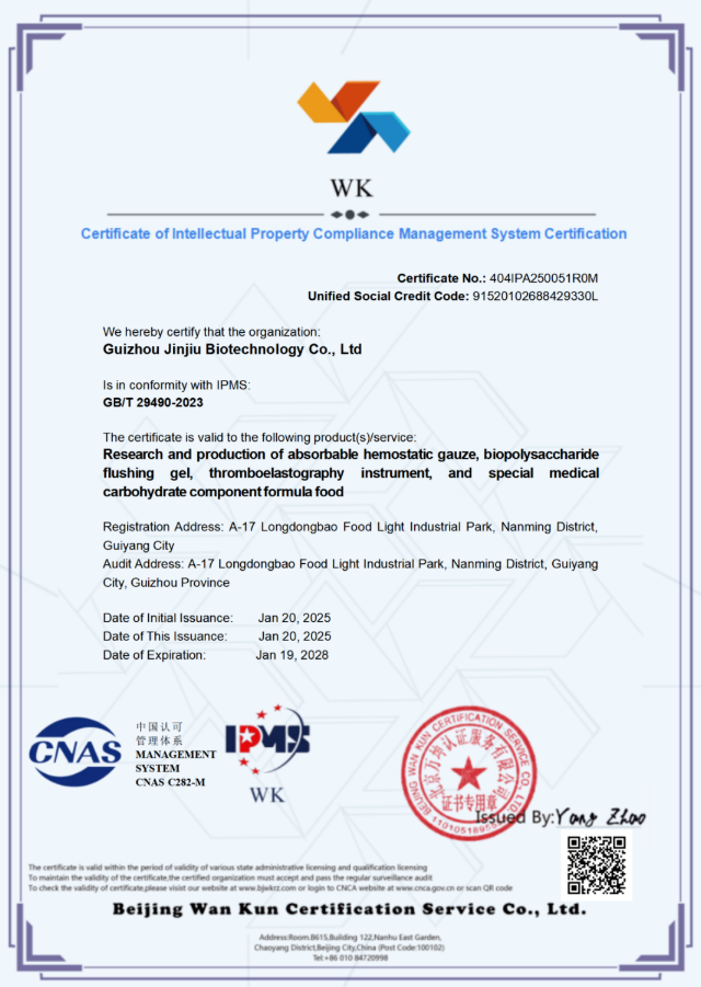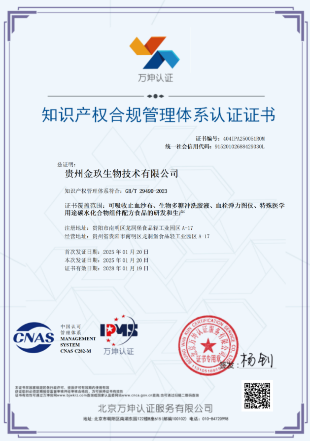 经过数月的精心筹备与不懈努力,金玖近日成功通过了知识产权合规管理体系认证,并荣获由北京万坤认证服务公司颁发的《知识产权合规管理体系认证证书》。该证书涵盖的认证范围包括可吸收止血纱布、生物多糖冲洗胶液、血栓弹力图和特医食品等多个领域。这一荣誉的取得,不仅是对该公司在知识产权管理方面长期以来工作的充分肯定,更是该司迈向高质量发展新征程的重要里程碑。