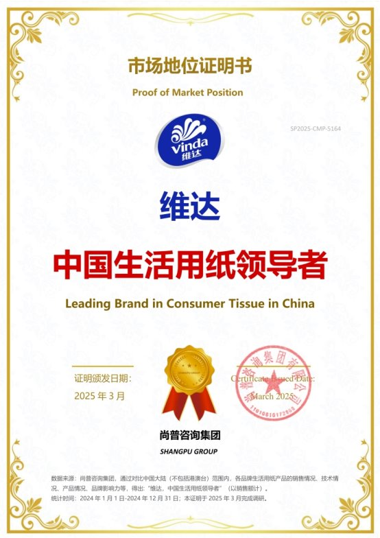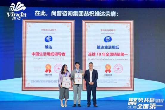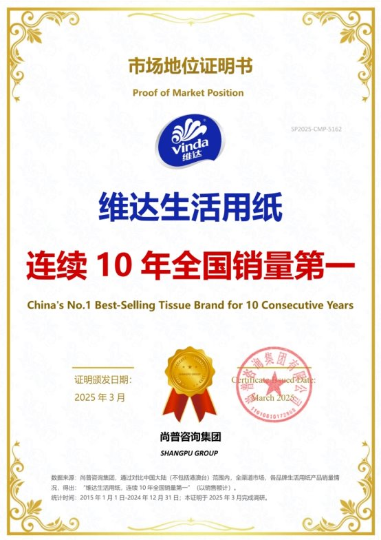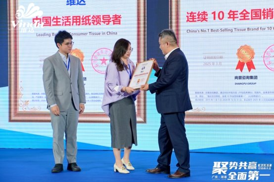 2025年4月,维达在广东珠海举办了以“聚势共赢,全面第一”为主题的2025年维达南区经销商大会。尚普咨询集团在活动现场为维达颁发市场地位证明书。此次维达荣获尚普咨询【维达生活用纸,连续10年全国销量第一】【维达,中国生活用纸领导者】市场地位证明,标志着维达在生活用纸行业的领导地位及市场的高度认可。